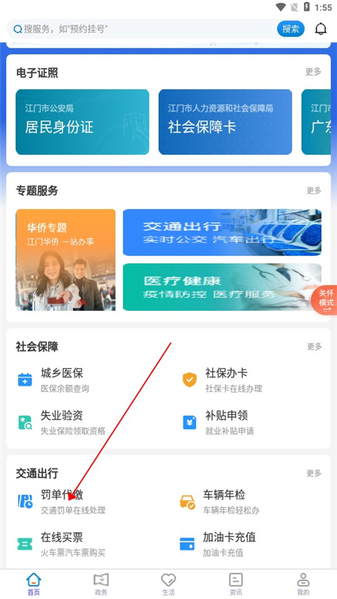 1、在本站下载安装并打开智慧五邑app,进入软件首页,在首页找到罚单代缴进入页面。