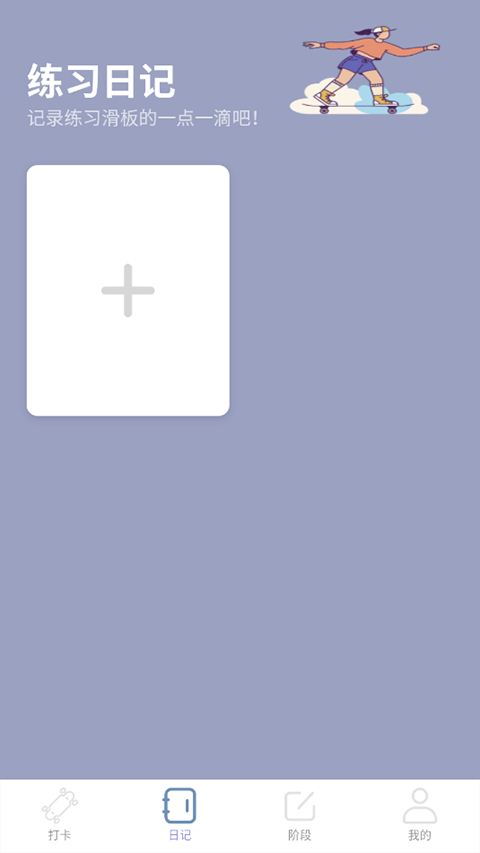 3、【日记】页面,点击“+”记录练习滑板的一点一滴;