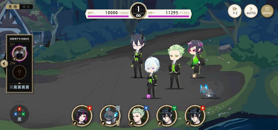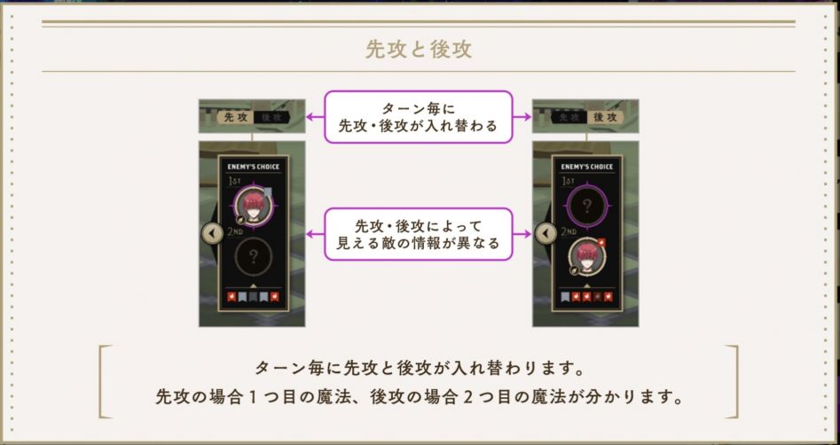 1、属性介绍 卡牌可以用于战斗的魔法技能的属性有四种:火、木、水、无。每张卡牌都有两个属性(可能相同)。其中,火克制木,木克制水,水克制火,在克制的情况下,魔法造成的伤害会是原来的1.5倍,若被克制,造成的伤害则是0.5倍。无属性不克制任何属性也不被任何属性克制,但是无属性会对所有属性造成1.1倍的伤害,即修正倍率。 2、战斗基础 以回合制为基础的战斗。一个完整的回合包括玩家队伍的行动以及对手队伍的行动。 在限定回合战中,只有五个回合;而在无限战中,有无穷(∞)个回合。当前场上的最后一张卡牌的攻击结束后即为一个回合,一个回合为1T(one Turn)。在战斗的过程中,通过界面上方的数值可以查看当前为第几回合。对战时,此回合拖出的两张卡片与对面的两个角色分别进行一对一的对战。第一回合时为玩家先手,玩家的卡牌会在相对应的敌方卡片之前进行攻击、加buff与debuff的操作。第二回合则为敌方先手,之后便按照此顺序进行循环。