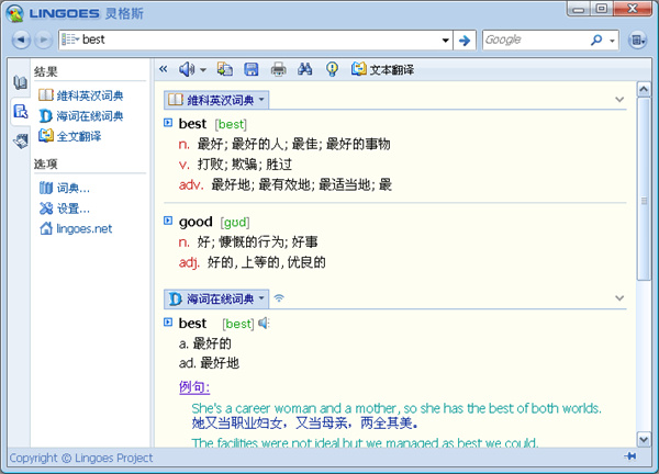 Lingoes内置的"句酷双语例句",多达800万的英汉例句库任您搜索,并对常用例句提供了整句朗读功能。