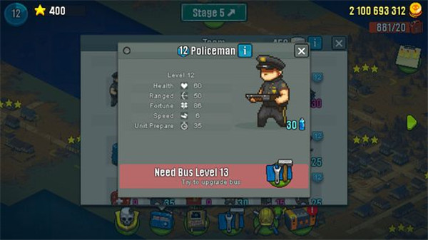 从玩法来说本作属于对推式塔防,别看校车不大,里边可是装着很多人呢。与其他对推式塔防游戏一样,我们需要攒够一定的能量,如图左上角蓝色和红色的能量,蓝色的可以召唤作战单位,比如平民,猎人,工程师等等,红色的则可以释放技能,达到一百还有意想不到刺激噢。为了快速完成任务,合理的兵种配合非常关键,一般来说你需要让平民拿着铲子冲在前边,然后让猎人在后边开火助推,当然了,前提是你有足够的勇气值来建立战线。