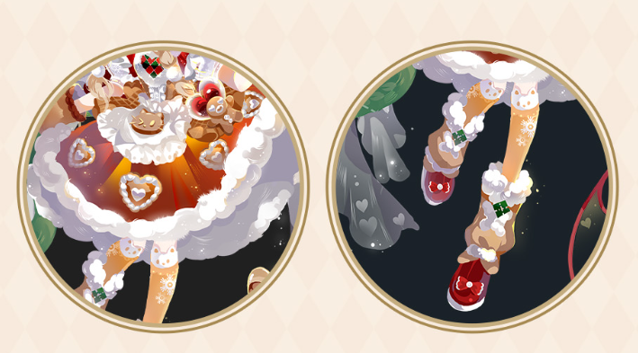 3)甜蜜点心裙:裙子融合冬日烘焙的温馨主题,以香甜的姜饼人、心形奶油曲奇等甜点元素作为装饰,点缀在蓬松的毛绒裙摆之间,打造甜蜜的节日情绪。搭配的猫猫雪地靴运用蓬松的绒毛镶边,在视觉上给人一种温暖的感受。袜口处点缀的可爱猫猫头图案,为期待礼物的夜晚增添一抹童趣。