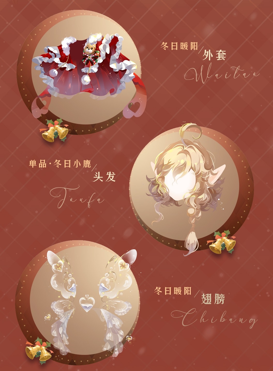 冬日暖阳套装整体以暖色系为主,用橙色和黄色铺陈主调,渲染出冬日独有的温馨活力,烘托出温馨和谐的氛围。银铃节经典色红色、绿色与白色作为点缀巧妙融入,为套装注入了鲜明的节日气息,并且配合主色调共同营造温暖而欢乐的节日气氛。