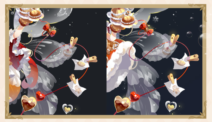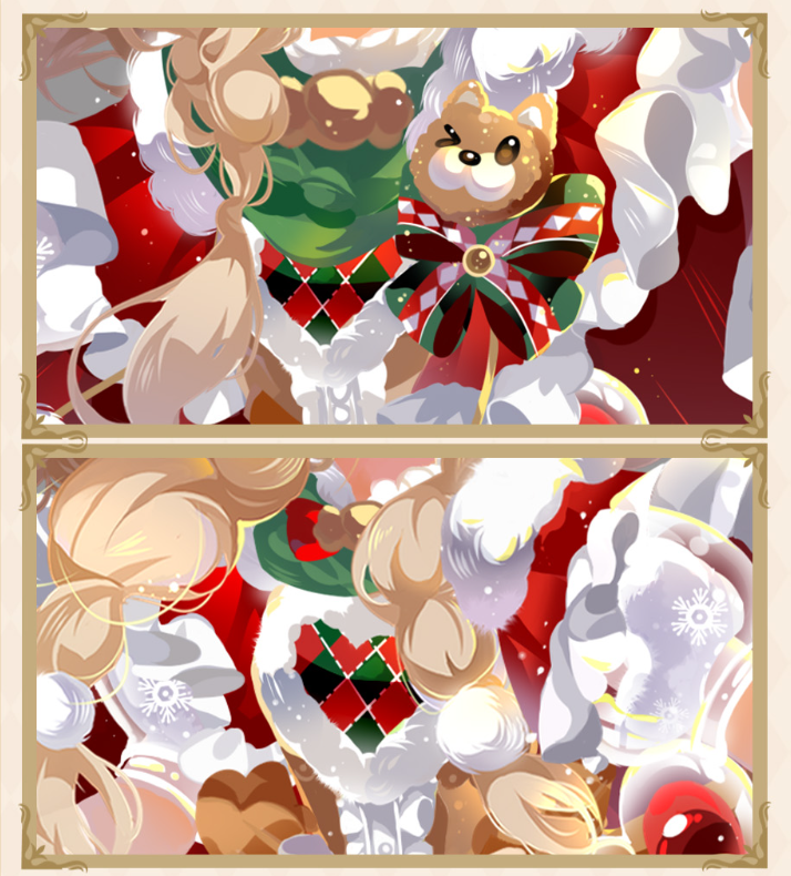 2)银铃节料理清单:手饰物的造型仿佛是一份悬浮的银铃节料理清单,红色丝带轻盈展开,点缀着金色和红色的爱心。长长的红色丝带间夹着绘有姜饼人、面包等甜点的烘焙纸笺,同时手部烤箱手套造型的细节设计,在梦幻氛围中巧妙增添一份贴心的守护。