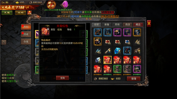 6、本服专属特色打金,可以获得红包使用后可获得元宝以及vip经验。