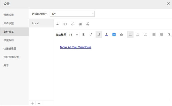 2、点击邮件签名, 在这里输入即可,支持插图图片、链接、表格,且有丰富的字体设置