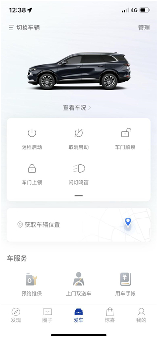 6、之后我们需要远程启动不再需要其他的操作,点击进入app点击爱车板块即可启动了。