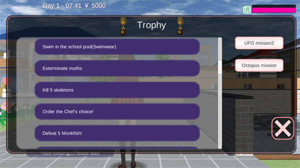 1、击败不明飞行物 首先把时间调到晚上21点,到咖啡馆附近,点击飞行,飞到跟楼层差不多高的位置,环视四周,找到飞行物,用武器攻击,飞碟的攻击死板,很容易躲避。 2、帮助迷路的人 把时间调到下午下午5点,来到公园找到绿色迷宫,飞起来可以看到里边有个白衣服的小姐姐,通过打招呼和对话或给予物品来增加亲密度,等到亲密度关系变成熟人,点击对话,搬运,任务就完成了。注意,当你成功帮助迷路的人之后,附近的小黄人和小蓝人会来打架,注意不要被误伤哦~ 3、找到带绿色耳机的人,并且帮他找到所有的矮小通道 此任务任意时间都能完成,首先去咖啡馆,咖啡馆对面的房子里有带绿色耳机的人,站到他的面前点击对话,完成第一个任务,再点击对话,接受任务,开始寻找矮小通道,在屋子外边有两个,屋顶上一个,屋子的卧室里床上一个,垃圾桶一个,厨房的冰箱里有一个,浴室里有一个,浴室外洗衣机上有一个,大厅的吊灯上有一个,沙发上有一个,找到10个矮小通道后去找戴绿色耳机的人,点击对话,任务就完成了。 4、帮忙消灭飞蛾 时间调到下午16点,地点选择便利店,帮助店员消灭飞蛾。 5、战胜婚礼上的危险 时间调整为18点,地点选择婚礼殿堂,配备好武器,当然为了生命安全,你可以选择开车把婚礼殿堂的大门给堵了,然后攻击新娘新郎,他们就会掏出枪支,干掉这两个人,就能够完成战胜婚礼上的危险任务了。 6、击败青铜雕像,石膏雕像和骷髅 把时间调整为晚上19点,在学校教学楼二楼右侧倒数第二个教室理科室,有一个骷髅骨架,在其他时间不会复活,晚上19点后靠近就会攻击你,击败这个骷髅;在三楼最右侧倒数第二个房间,晚上19点后会有四个骷髅,击败这四个骷髅,就能完成击败骷髅任务。 青铜雕像在三楼的最右边倒数第三个教室,这个教室只会在晚上19点后打开,进去后靠近青铜雕像,他就会攻击你,掏出武器击败青铜雕像完成任务。石膏雕像在最右边倒数第四个教室,石膏雕像只会在19点后复活,靠近她切换飞行状态,他便开始攻击你,战胜她,任务完成。 7、这个图就是玩家可以接取的任务,在游戏的左上角奖杯的图标里,点击即可进入此界面接取任务。