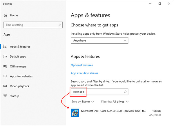 1、.NET 使用 Windows“应用和功能”对话框来删除各版 .NET 运行时和 SDK。 下图显示了“应用和功能”对话框 。 可以搜索 core 或 .net 来筛选和显示安装的 .NET 版本 。