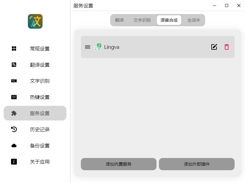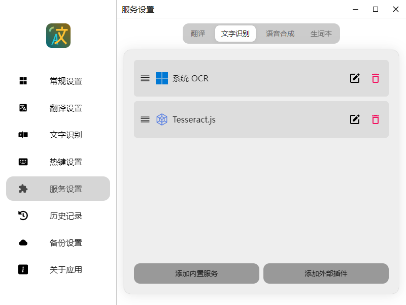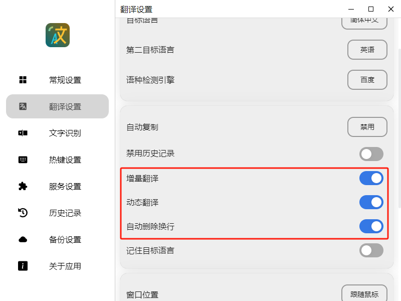 重点要设置的地方是“翻译设置、文字识别、热键设置、服务设置” 1、翻译设置 可以开启自动复制、增量翻译、动态翻译、自动删除换行、记住目标语言、隐藏原文、隐藏翻译窗口等。