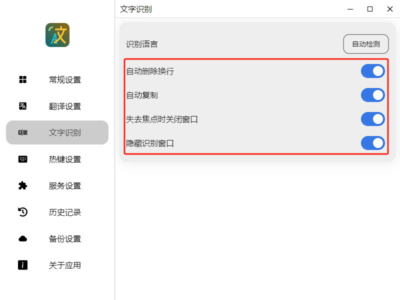 有自动删除空行、自动复制、自动隐藏窗口、隐藏识别窗口,自动复制+隐藏识别窗口同时使用,就可以快捷键截图、截图后不会出现识别窗口,然后自动复制到剪切板。