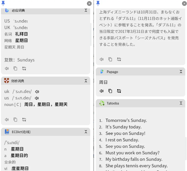 (2)翻译句子时发现有的不反应,因为它们是针对单词的,选中单词的时候才会有反应,分别是英汉词典和例句查询。