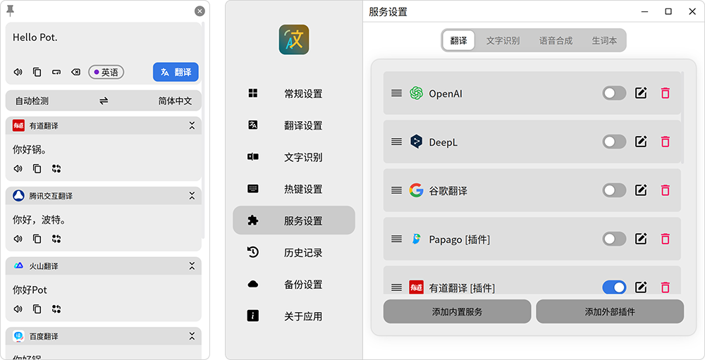 pot翻译软件是一款跨平台划词翻译和OCR工具,全称为Translator of Pylogmon,中文名称派了个萌的翻译器。软件默认支持的有 DeepL、必应翻译、Yandex以及谷歌翻译,软件的核心功能有输入翻译、划词翻译、文字识别(OCR)和截图翻译,用户可以在热键设置中自定义快捷按键,提高使用体验。pot翻译软件还拥有强大的插件系统,支持自定义翻译接口、OCR接口、语音合成接口、生词本接口!这将成为您的最后一款翻译软件,快来下载使用吧!