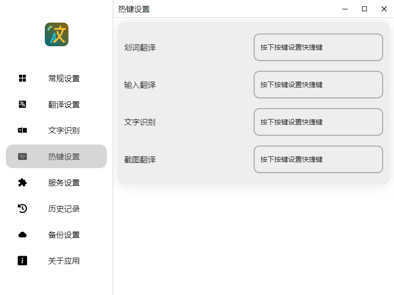 顾名思义就是设置快捷键,划词翻译(选中文本后使用快捷键翻译)、输入翻译(弹出对话框输入后翻译)、文字识别(OCR)、截图翻译(OCR后自动翻译)。