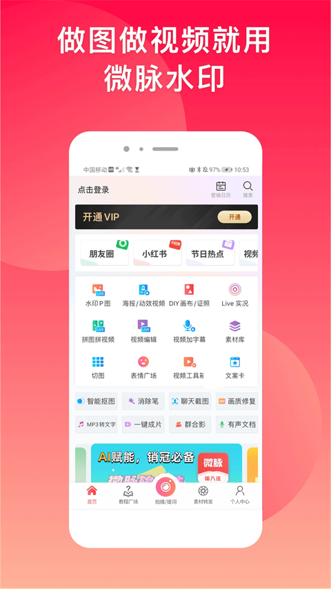 1、支持N多在线水印模板! 2、支持从相册上传logo作为水印! 3、一次处理100张,保证图片清晰度! 4、支持文字水印,修改字体、颜色、透明度! 5、单张模式和批量模式,随意摆放不同图片上的水印位置; 6、支持画笔、马赛克、箭头、圈点等功能。 7、支持文章制作功能; 8、支持用户自主推广!功能介绍