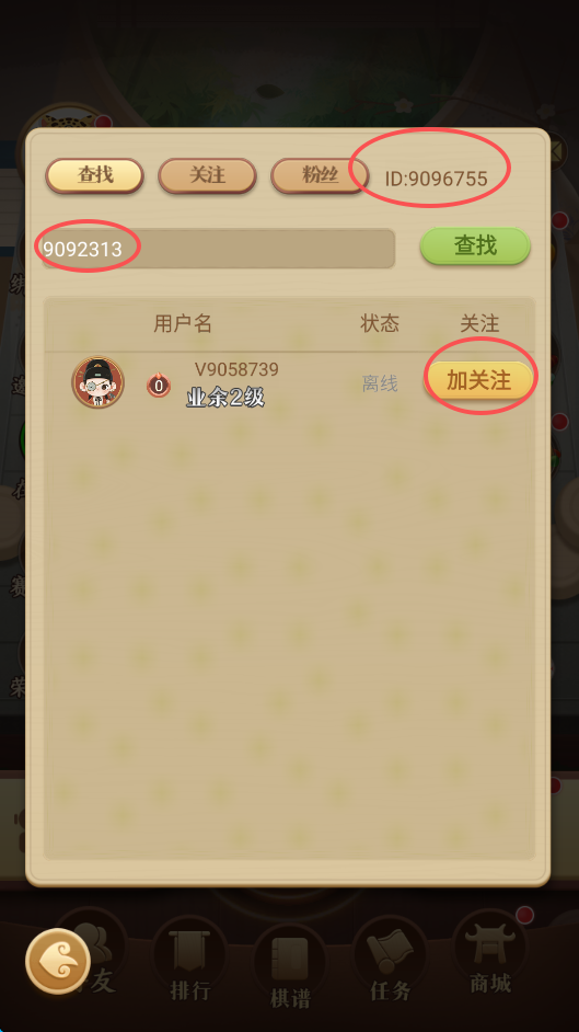 8、每个账号都有一个唯一的ID,也就是屏幕右上角的“ID”,在输入框中输入朋友的ID,点击查找,随后再点击关注就可以了。
