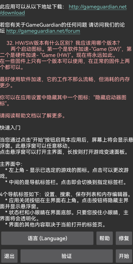 1、为什么我不能输入大于 99 或 60,000 的值? 您已找到字节或字的值。要输入更大的值,请查找双字 (Dword)。 2、 GameGuardian 运行时,屏幕上会显示文本消息(提示信息),或者屏幕底部会出现一个黑色圆圈。如何解决这个问题? 在某些固件上使用第三级“防止卸载”选项会导致文本消息(提示信息)一直显示在屏幕上,或者出现一个黑色圆圈(空白消息)。如果出现这种情况,请勿使用第三级选项。 3、GameGuardian 在PC上的Android模拟器中搜索值的速度非常慢,而且需要很长时间。 很可能是您的电脑BIOS中禁用了虚拟化功能。请启用它。GameGuardian 运行在模拟器内部,因此其运行速度取决于模拟器的速度。 如果虚拟化功能已启用,但速度仍然很慢,请检查模拟器的设置,或尝试使用其他模拟器。 您也可以使用另一款工具——Cheat Engine for PC,它的搜索速度更快,并且提供GameGuardian所不具备的许多功能。 4、 如果游戏检测 GameGuardian怎么办? 尝试以下选项(可单独使用或任意组合): 1)启用“在游戏中隐藏 GameGuardian”选项。通常启用选项 2、3 和 4 即可。 2)不要取消使用随机名称重新安装 GameGuardian。此操作会在 GameGuardian 首次在虚拟空间之外运行时执行。 3)使用 XPrivacy 或类似工具。请在网上搜索相关教程。 5、如果游戏中显示的值经过四舍五入,我该如何查找该值?例如,1.85M。 搜索范围。范围限制取决于舍入规则。例如,标准舍入范围为“1845000~1854999”。 6、我添加了图标,但它消失了。我该如何找回它? 图标会变成透明的,但你仍然可以点击它。点击它原来的位置,然后通过界面更改设置。更新日志