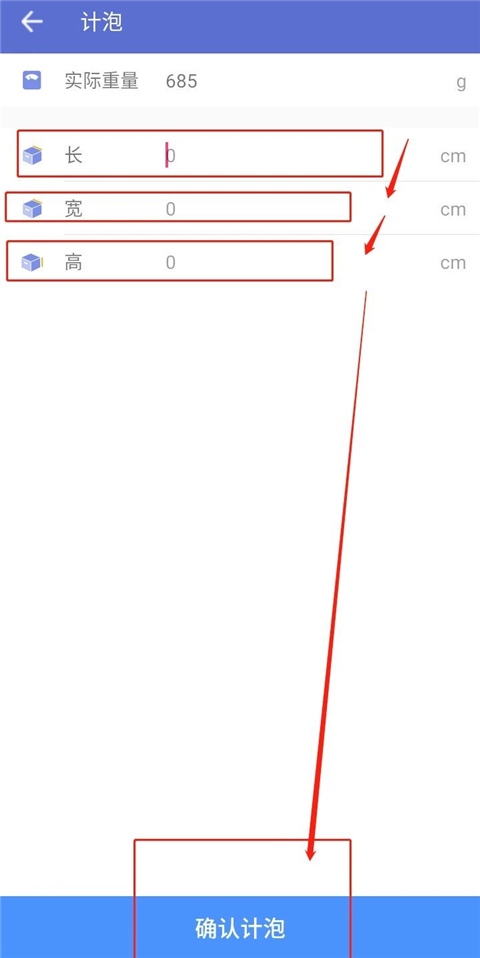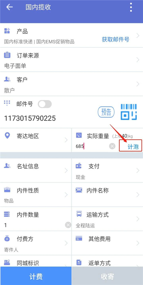 9、对于轻泡邮件,要输入长宽高计算体积重量。