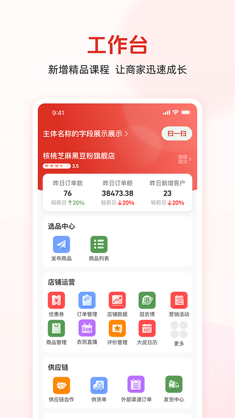 1、订单管理:处理订单,快捷方便 2、商品管理:上架编辑,高效管理 3、消息通知:直聊买家,把握时机 4、账户资金:快捷提现,收支清晰 5、发货管理:扫描单号一键发货,助力商家提高效率 6、商品评价:可查看不同商品、不同评分、不同时段的评价,还可进行回复和 7、售后退款:清晰查看退款信息,随时处理售后 8、店铺信息:支持修改店铺名称、头像、招牌图、资质等 9、经营数据:多维度查看经营数据,方便了解经营成果 10、发农民说:手机随时发农民说,记录商品心路历程软件优势