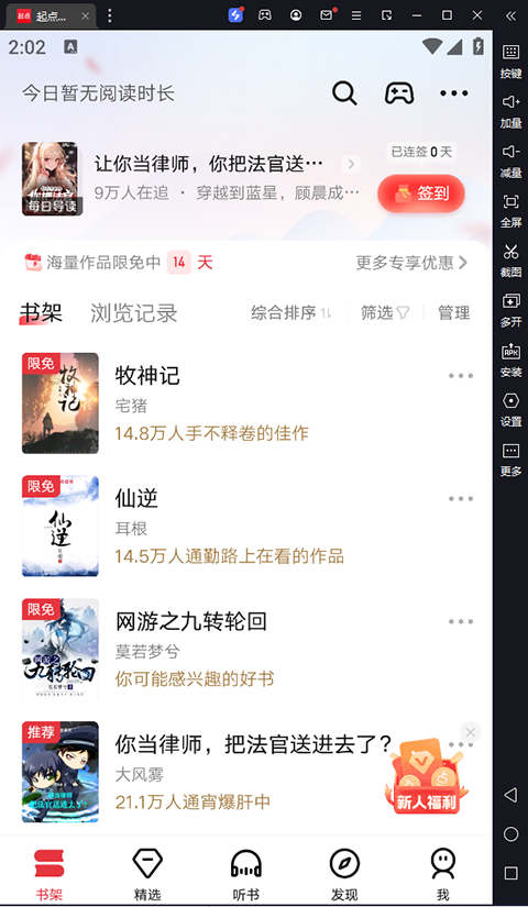 看小说是现在大多数用户比较喜欢的打发时间的方式,如果用户想要第一时间看到自己喜欢的小说,那么这款起点读书电脑版就是你最需要的,作为最全最大的中文原创网络文学网站——起点中文网,相信众多读者都不会陌生,许多实体小说上都印有起点中文网的字样,众多作者也都以进入起点为目标,当然现在众多文学网站遍地开花,其他网站也有不错的待遇和小说。起点读书虽然大多数的书籍都是需要用户付费购买观看的,但是偶尔也会有活动让用户们免费阅读,各种热书、新书层出不穷让你一次看个够。除此之外,起点读书还会不定期的举办各种活动,有趣更有料,畅读券、起点币、经验值等等福利大礼让你收到手发软。本站为大家提供的是起点读书电脑版,下载完成后通过安卓模拟器打开即可。
