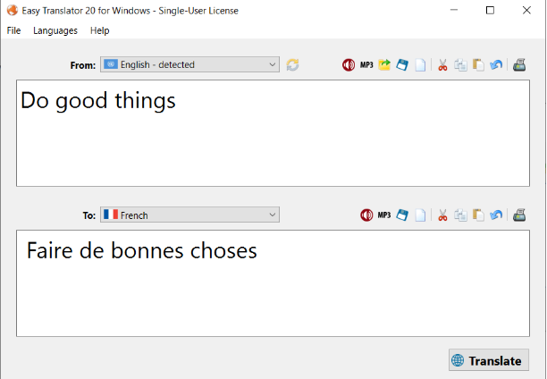 Easy Translator是一款简单易用的语言翻译软件,软件利用Internet机器语言翻译引擎的功能,使您能够轻松地在主要国际语言之间翻译Web内容,信件,聊天和电子邮件内容。除此之外,这款软件界面简洁,体积小巧,不占内存,操作也十分简单,人人都可以使用,用户只需将需要翻译的文本粘贴至窗口中,选择你需要翻译成的语言,然后再点击翻译按钮即可。与此同时,Easy Translator 15功能十分强大,不接可以支持汉语、日语、英语、法语、德语等常见语种翻译,还能够提供104种语言之间进行快速互翻,全方位满足你的使用需求,是你日常学习外语必备的翻译神器。另外,这款软件还采用了增译法、省译法、转换法、拆句法、合并法、正译法和反译法等多种翻译方式,最后转换成后的语音用户还可以保存为mp3文件类型,方便以后随时播放或使用。