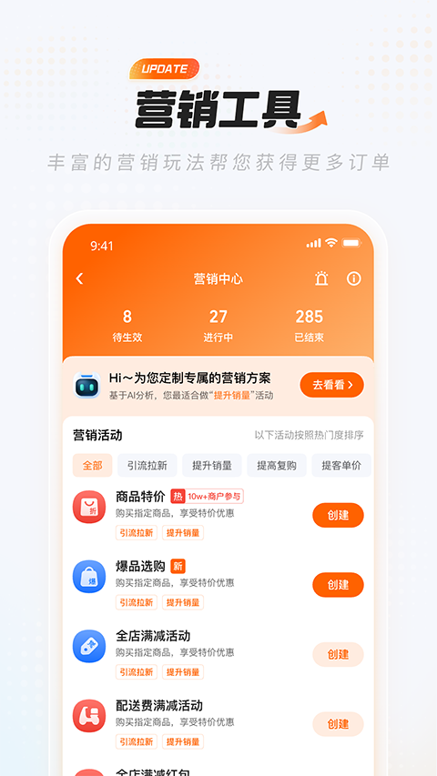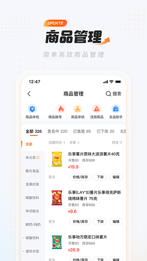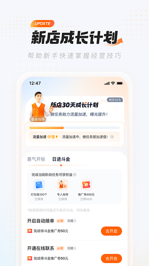 1、订单管理:随时随地接单,处理催单,操作退单 2、账户管理:订单对账简单明了,按天结算,账期打款 3、门店管理:餐厅信息随时设定,自由开关门店 4、便捷操作:界面简洁,分类清晰,易操作 5、帮助商家在线实时促销,轻松获客没烦恼 6、专属个人店铺中心,线上管理更加方便轻松使用帮助