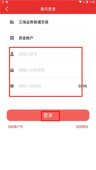 3、然后输入自己的账号还有交易密码和验证码,在点击登录注册即可。