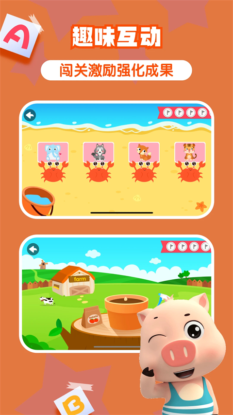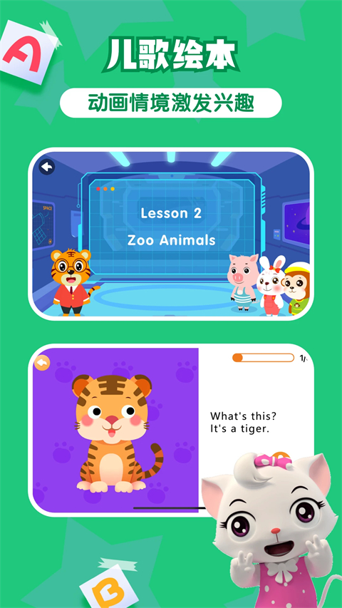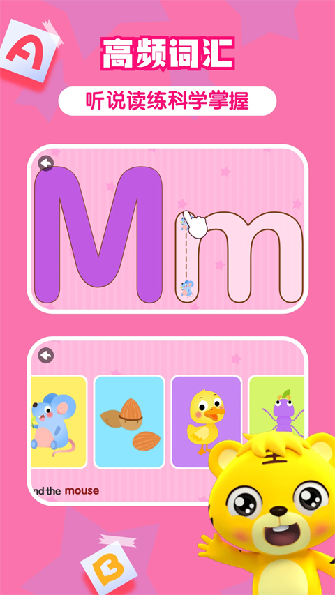 26个字母单元、16+高频词组、200+英文单词、44首英文儿歌、16+互动游戏,分阶段对字母和单词进行专项学习。以认、说、写、练的方式学习字母,更有儿歌和闪卡的结合,轻松学习常用高频词汇。 认:形象生动的字母设计。 说:标准发音跟读,鼓励儿童张口加深阅读记忆。 写:标准引导字母书写,规范儿童的学习方式。 练:有趣好玩的练习游戏,提起儿童学习的兴趣。 高频词还有闪卡、视频、绘本等有趣的教学形式相辅,让儿童全面理解字母、单词以及翻译之间的对应关系。软件功能