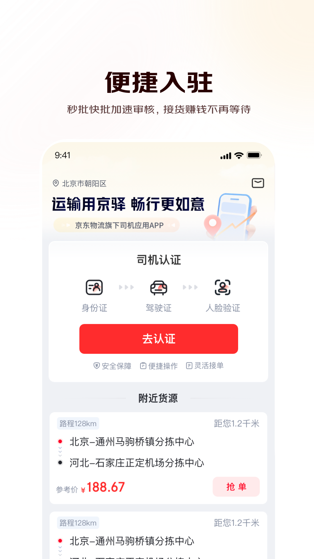 1、审核未通过怎么办? 您可登陆APP-我的-我的认证,依次按照提示核验注册信息的真实准确性,如有信息异常可点击页面“编辑”按键进行重新上传提报。为保障司机权益,平台严格遵守注册人信息真实性和一致性原则。 2、如何提现? 近期推出金融支付模式,企业付款后,您可以自行提现,路径:APP-结算-待结算-点击“提前收款"按键,点击后10分钟左右运费到账。该功能需要支付一定比例的运费保障服务费,具体费用详情您可点开【首页】或【找货】页面中的货源右上角“运费保“标签查看。不操作手动提现时,运费在支付成功后10天自动到账(不收取任何费用)。 3、金融支付是什么意思? 平台推出金融支付模式,企业支付后,您可以选择【提前收款】但需支付一定比例的运费保障服务费,具体费用详情您可点开【首页】或【找货】页面中的货源右上角“运费保”标签查看。不操作手动提现时,运费在支付成功后10天自动到账,不收取任何费用。 4、报价方式是怎样的? 目前京驿货车有两种报价方式,一种是司机自由报价,一种是抢单模式(抢单模式将会显示货源价格,司机可以此为依据直接抢单或进行报价),期待您的使用!更新日志