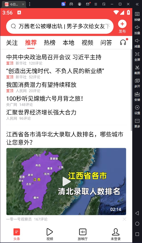 对于今日头条相信大家并不陌生,这是一款非常优秀的新闻资讯阅读软件,其凭借其优质的资讯内容、广泛的领域范围以及独特的个性化推荐功能,深受广大用户的喜爱。由于许多朋友想下载电脑版进行使用,但官方还未推出电脑客户端,为此你可以先试试借助安卓模拟器打造的今日头条电脑版,相较于手机版而言,电脑版的今日头条操作起来更加方便,不管是阅读资讯还是创作文章,甚至是让你直观的看到自己的内容数据,都非常实用。此外,今日头条当中还提供了高清视频、音乐MV、新闻视频等特色功能,满足你对新闻娱乐的一切需求,感兴趣的朋友欢迎你的下载体验。
