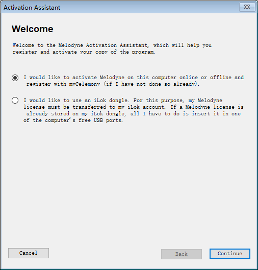 1、首先安装主程序,安装完成后先不要打开。将替换文件复制替换到软件安装目录下的 Resources 文件夹(默认为:C:\Program Files(x86)\Celemony\Melodyne.3.2\Resources)中。以管理员身份运行主程序并且打开注册机,选择第一个,点击【Continue】。