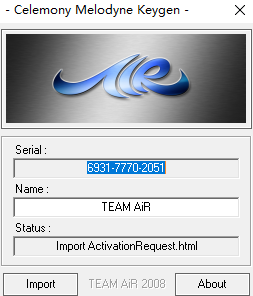 3、点击【Export】会导出一个 MelodyneActivationRequest.html 文件,点击注册机上的 Import 导入 MelodyneActivationRequest.html 文件后会生成一个 Melodyne.license 文件。