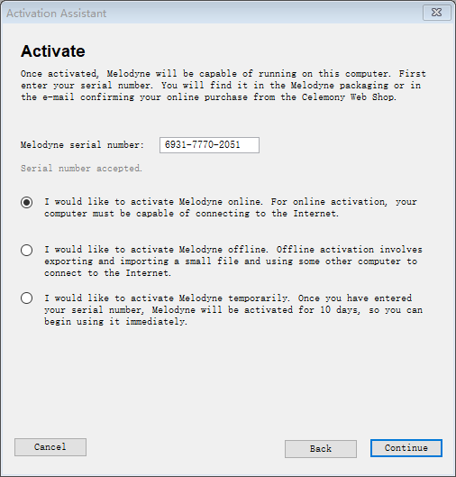 2、将注册机 Serial 文本框中的内容复制到 Melodyne 的 serial number 框中,选择第二个离线注册,点击【Continue】。