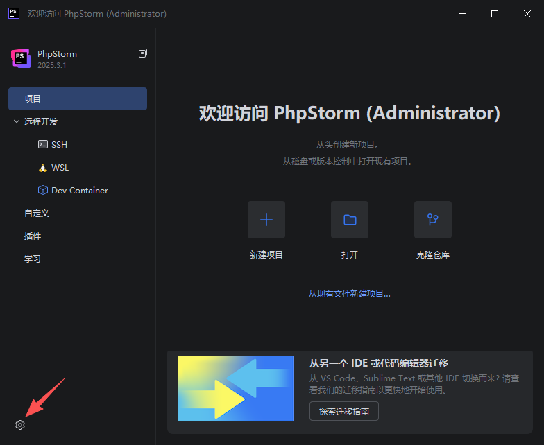 1、运行PhpStorm2025软件,点击左下角设置标识。
