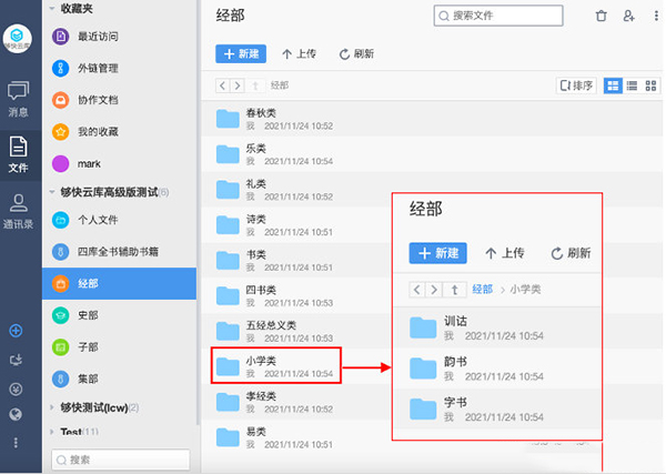 够快云库是一款可免费使用的文件共享以及云存储的工具,此次为大家带来的是够快云库中文件的基本操作技巧,还不知道文件操作技巧的小伙伴,快来看看学习一下吧! 一、够快云库中新建文件夹的方法 1、打开够快云库,点击主页面中的【新建】按钮,会直接弹出新建文件夹和模板文件的选择页面。 2、点击选择需要创建的文件夹以及模板,选择完成后就会出现在文件列表中。并且建立成功后,还可以对文件夹或者模版进行更名。 二、够快云库中文件夹上传和下载的方法 1、点击页面中的【上传】按钮,将需要上传的文件或者文件夹选中,选择完成之后点击【确定】。接下来文件直接拖动到文件列表中,即可等待上传。 2、下载文件的方法有三种,非别是: ①选中需要下载的文件并双击,文件就会直接开始下载并且还可以浏览; ②选中下载文件点击【下载】按钮,选择本地下载保存的文件位置,点击【确定】即可下载; ③还可以通过拖拽的方式,直接将选中的文件拖动到本地目录,即可下载。