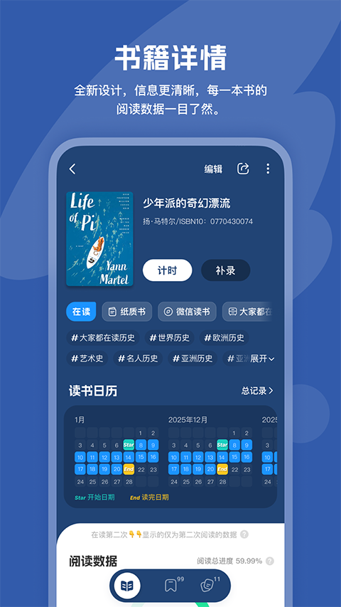 1、读书计时 读书计时器,轻松记录自己的读书时间、页码等数据。 2、阅读统计 多维度、多方面详细展示自己阅读状况,阅读时间、阅读类型、阅读天数、阅读进度、阅读偏好等,轻松回溯自己过往的阅读状况; 3、读书笔记,拍照识别(OCR)简单快捷 目前市面上识别效果最好的OCR,拍照识别的功能轻松方便的把书中的句子转化为文字信息保存下来; 4、书籍管理 通过标签、阅读状态归类书籍,还可以自定义设置书架分类自己的爱书; 5、读书小组 与知己好友一起共读,一起成长更新日志