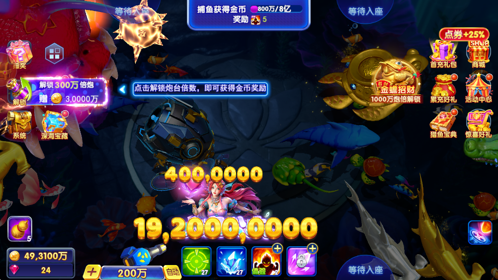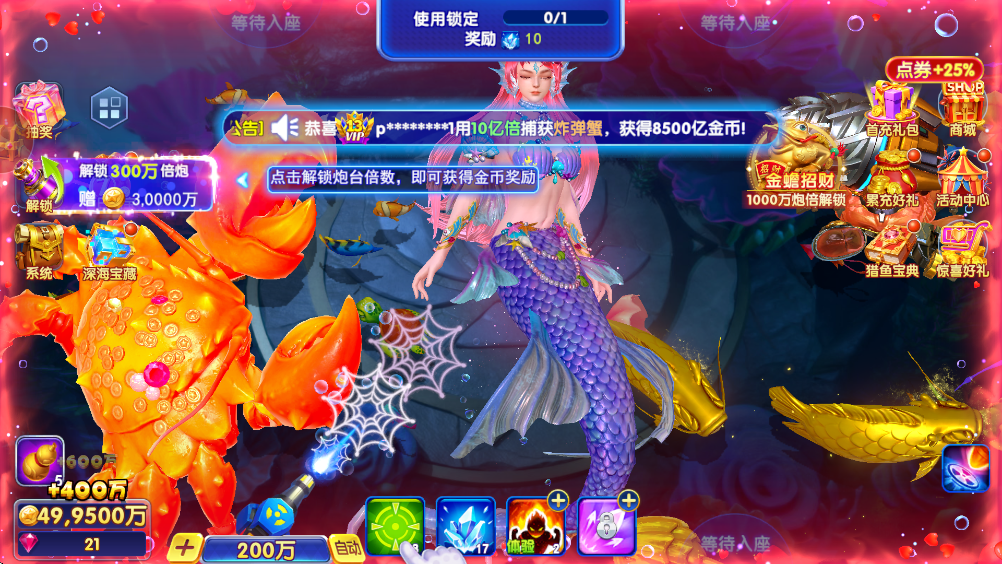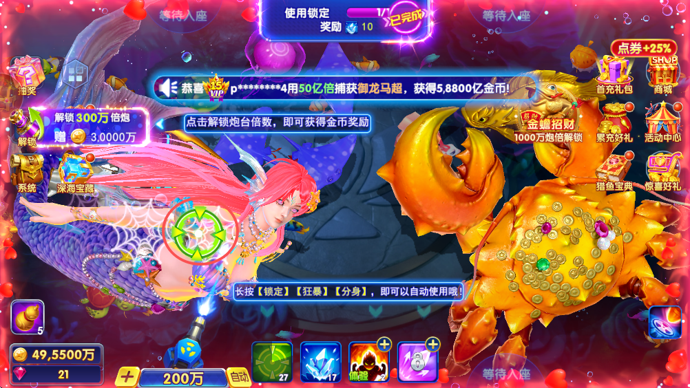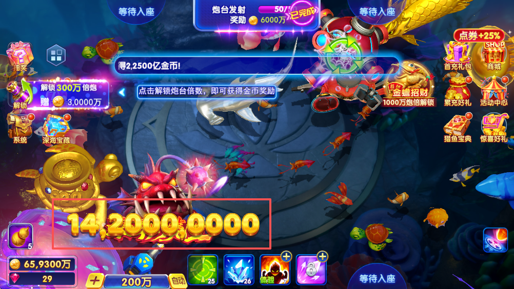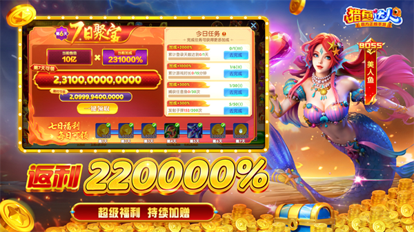 1、海量炮台炫酷翅膀,个性捕鱼深海称王 几十种炮台皮肤、各色翅膀任您挑选。每一款都有炸裂的特效,畅快的体验,总有一款适合您。更有大量炮台翅膀特权,叠加使用之下,捕鱼更轻松、更畅快! 2、三维场景视觉盛宴,丰富多样杜绝疲劳 现推出全新狩猎模式,全新4个风格迥异的开放世界让您身临其境,未来还将追究更多场景。超棒3D体验,高画面品质,优秀美术团队匠心巨制,3D场景和模型搭配海量特效,让您过目难忘! 3、超多房间特色玩法,刺激体验告别重复 特殊BOSS全新来袭,深海鬼王珍宝无数,吞天魔猿毁天灭地,神龙熊猫阴阳龙盘,银龙枪魂枪出如龙,机械公敌爆破炸弹……BOSS数不胜数,等您来一一挑战! 4、福利多多超级补足,精彩活动轮番上阵 登录就送海量金币,新手七日豪礼最高十倍,每天还有各种任务等你来完成!收集各种礼器享强力补足金币特权、充值加成特权。每周活动不间断,更有节日活动、赛季活动,统统都是福利! 5、街机捕鱼经典再现,原汁原味畅爽体验 经典街机捕鱼全新体验,配上跨时代的3D效果,经典的音效配乐,超高爆率,让您轻松秒杀,一炮上亿不是梦!海量玩法尽情体验,不能错过的捕鱼游戏!猎鱼达人小米版新手玩法指南