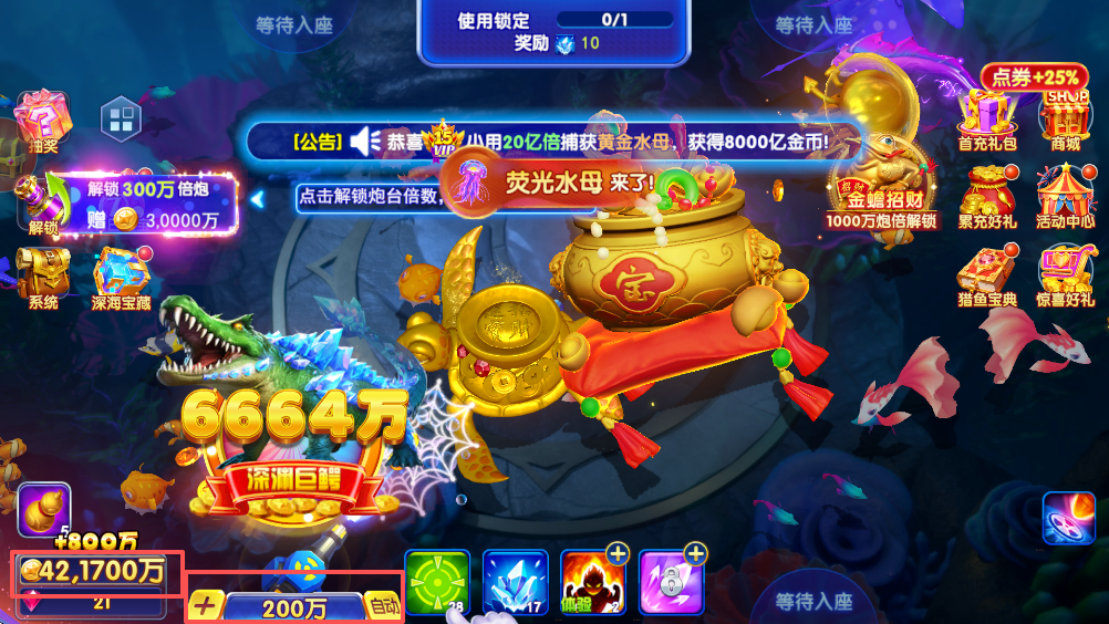 1、屏幕左下角的为玩家的总资产,玩家可以自行调整自己每一发炮弹的价格,相对,价格越高,捕捉成功率也就越高。