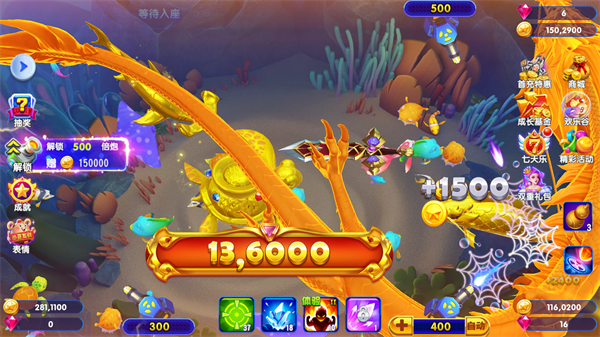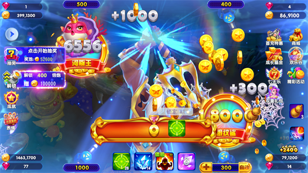 3、释放出奖金鱼后,要集中火力捕条奖金鱼,不要三心二意的漫无目的地攻击,一是浪费火力和金币,二是奖金鱼也随时可能溜走,到时候会赔了夫人又折兵,得不偿失了。