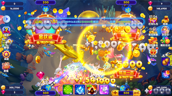 1、海量炮台炫酷翅膀 个性捕鱼深海称王 几十种炮台皮肤、各色翅膀任您挑选。每一款都有炸裂的特效,畅快的体验,总有一款适合您。更有大量炮台翅膀特权,叠加使用之下,捕鱼更轻松、更畅快! 2、三维场景视觉盛宴 丰富多样杜绝疲劳 现推出全新狩猎模式,全新4个风格迥异的开放世界让您身临其境,未来还将追加更多场景。极致3D体验,超高画面品质,顶尖美术团队匠心巨制,3D场景和模型搭配海量特效,让您过目难忘! 3、超多房间特色玩法 刺激体验告别重复 特殊BOSS全新来袭,深海鬼王珍宝无数,吞天魔猿毁天灭地,神龙熊猫阴阳龙盘,银龙枪魂枪出如龙,机械公敌爆破炸弹……BOSS数不胜数,等您来一一挑战! 4、福利多多超级补足 精彩活动轮番上阵 登录就送海量金币,新手七日豪礼最高十倍,每天还有各种任务等你来完成!收集各种神兽享强力补足金币特权、充值加成特权。每周活动不间断,更有节日活动、赛季活动,统统都是福利! 5、街机捕鱼经典再现 原汁原味畅爽体验 经典街机捕鱼全新体验,配上跨时代的3D效果,经典的音效配乐,超高爆率,让您轻松秒杀,一炮上亿不是梦!海量玩法尽情体验,不能错过的捕鱼游戏!猎鱼达人h5刷金币技巧教程