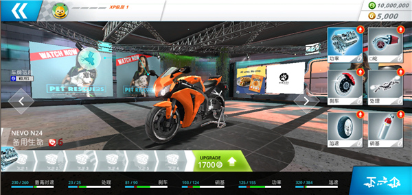 3、在这里可以更改摩托车的配件,例如车轮、引擎、刹车等。