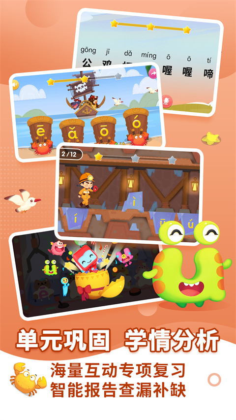 83节拼音课程其中6个单韵母 + 23个声母 + 18个复韵母 + 16个整体认读音节 + 20个单元复习,涵盖“认、读、写、调、玩”四个部分”,让孩子趣味学习拼音。 63个原创拼音动画,动画展现字母字形 50个主题互动场景,情景教学趣味学习 126个真人讲解视频,讲解读写规则 100+个情景互动游戏,寓教于乐强化记忆【产品亮点】