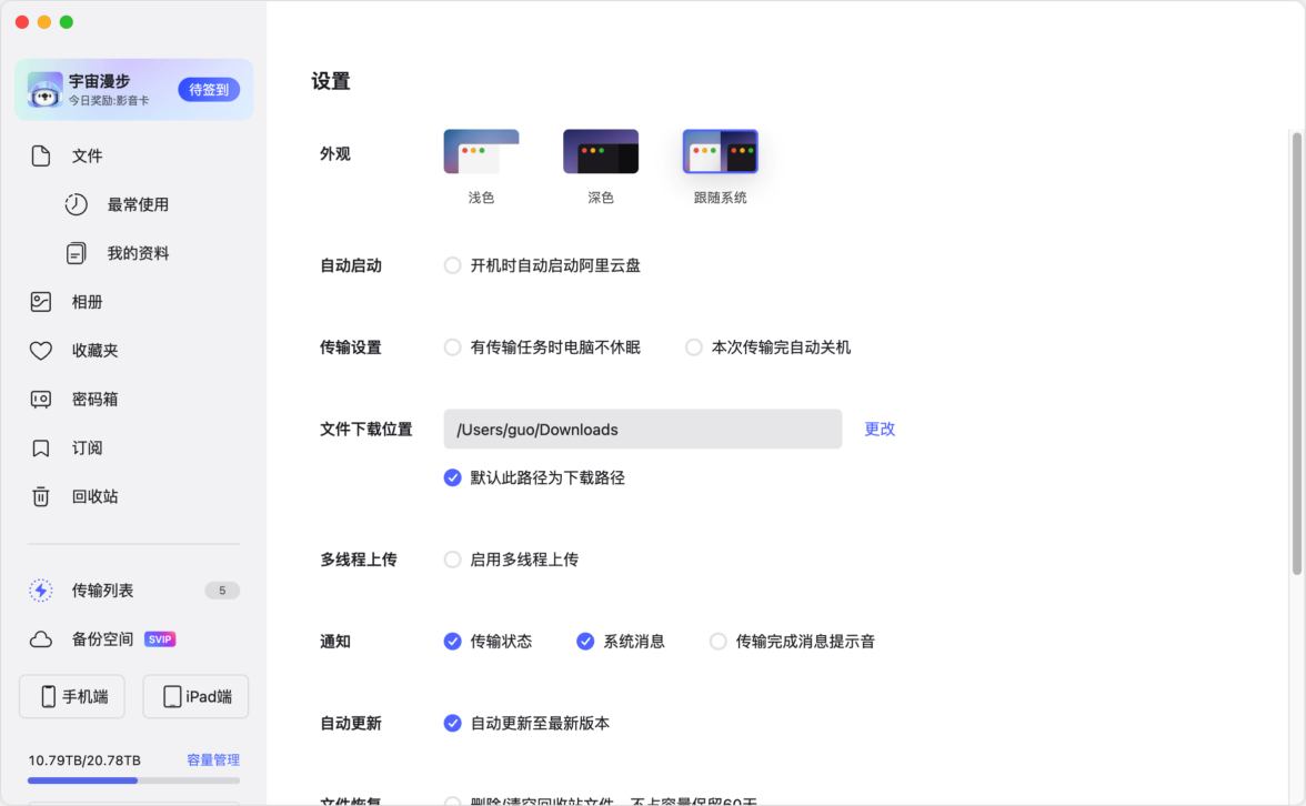 阿里云盘mac版是一款阿里云团队精心打造的智能储存软件,该软件功能非常强大,拥有网盘存储功能,并且是超大的储存空间,用户们使用体验会非常好的,网络是非常稳定的。版本设计之简体现的淋漓尽致,下载速度直接碾压某网盘,在10M/S左右浮动,并支持深色模式,这样即使在晚上观看视频,也能够很好保护自己的眼睛,而且你还可以任意选择画质、倍速、选集等功能,也称得上是一个不错的播放页面了。并且拥有智能分类效果,让你可以更好的进行分类储存。可以为你快速的存储文件,将你手机的视频以及文件和图片等更好去管理,免费的大内存,让你的资料更好保存管理,非会员也可以极速下载了,高效极速,为各位用户提供更可靠安全的存储备份。阿里云盘mac客户端更为优质的下载体验更为大的免费空间,虽然现在仅仅实在内测但是对于相当对的用户而言非常的值得期待。与此同时,软件拥有强大的网盘存储功能,软件用户提供了超大的内存空间,并且下载不限速,网盘安全稳定,支持智能分类,用户可以轻松进行云储存,文件放心存,有兴趣的小伙伴快来下载体验吧!