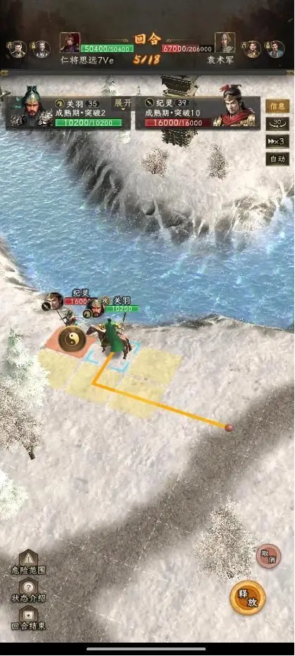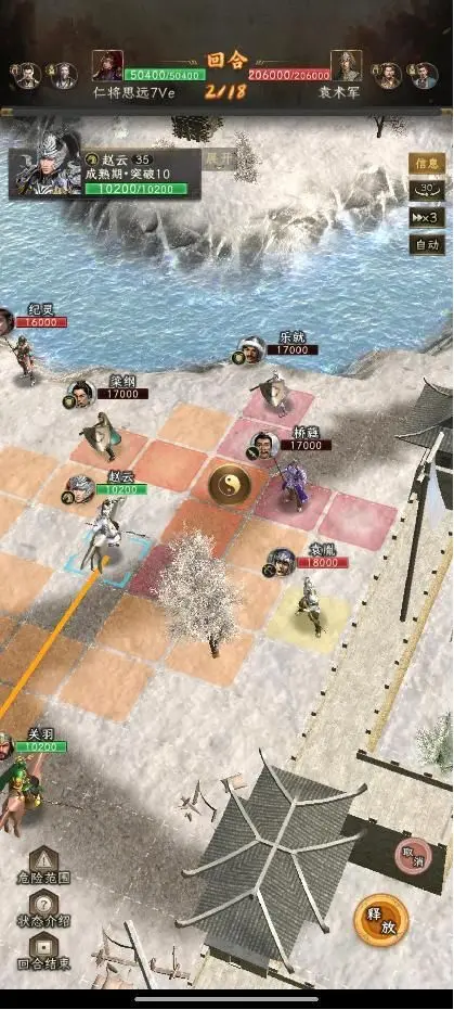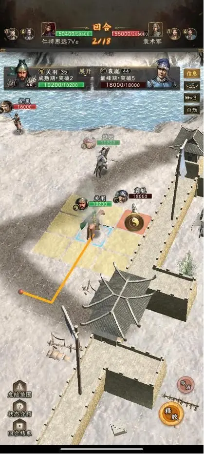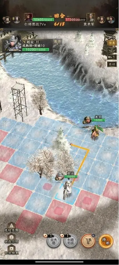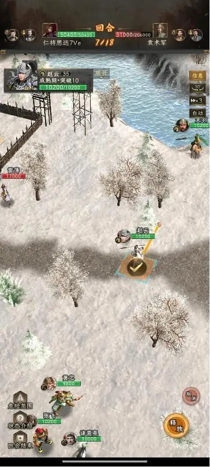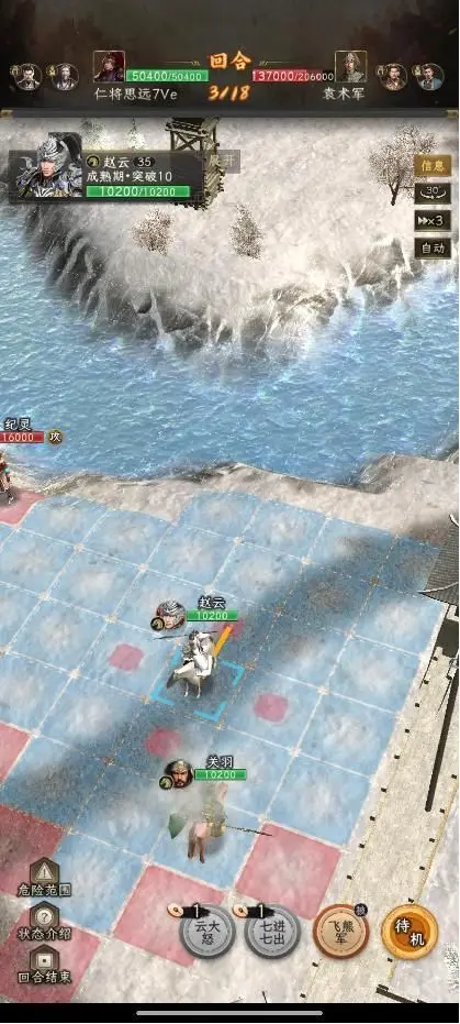 第二回合:赵云上到图中位置放七进,关羽秒掉袁熙。如果关羽伤害不够,秒不掉袁熙,那就不能无损过关,但是影响不大。