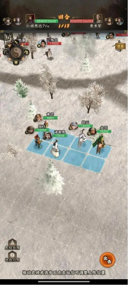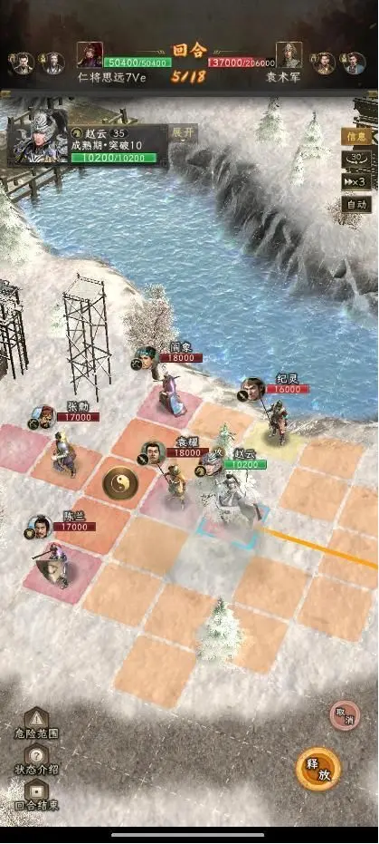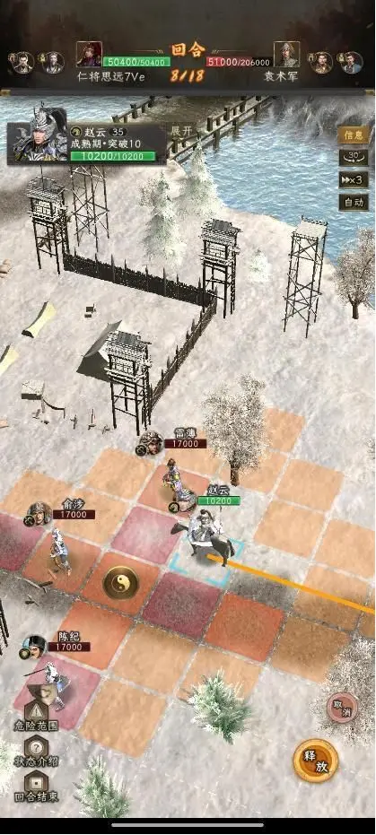 第七回合,赵云下移2格,放怒。注意这个位置,刚好在雷薄的攻击范围之外,而且刚好在俞涉的技能范围之外。
