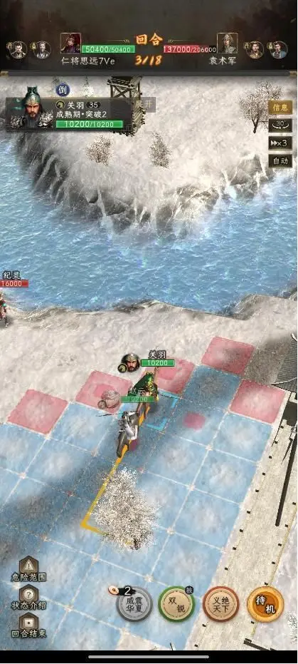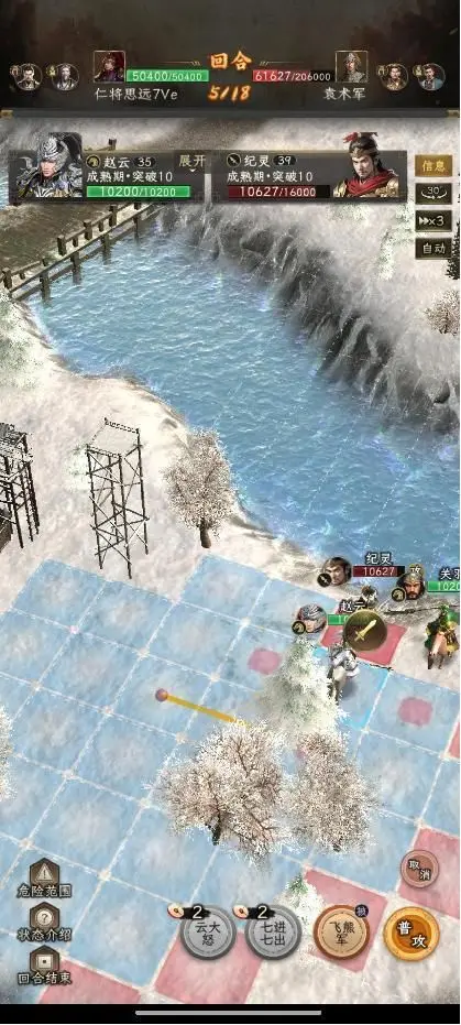 第三回合,赵云下移一格,关羽上来补赵云的位置(为了助刀纪灵,如果赵云的物攻高到能秒掉纪灵,那关羽就不用再动了)。