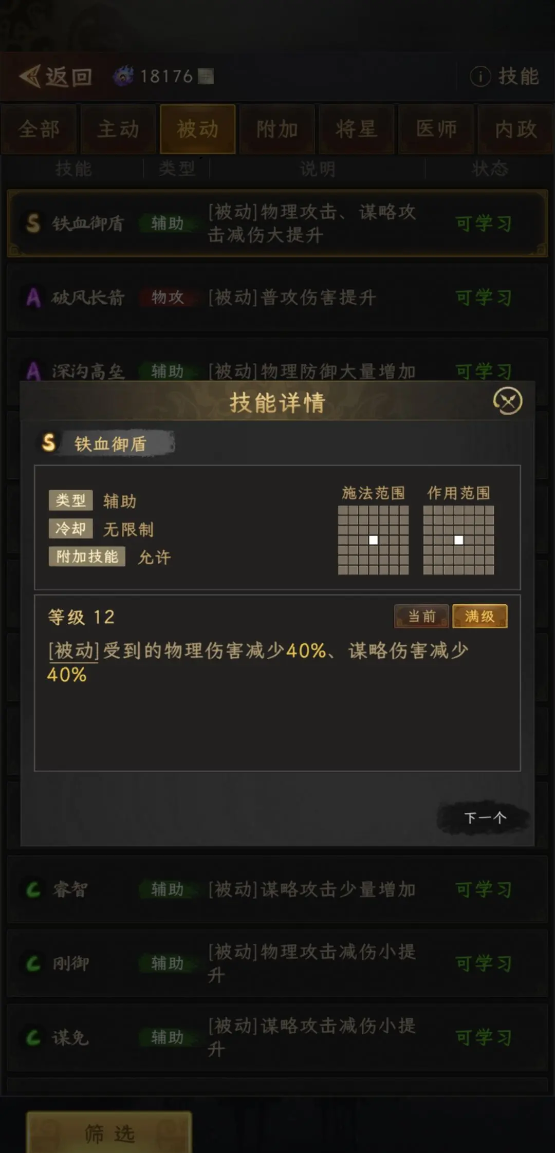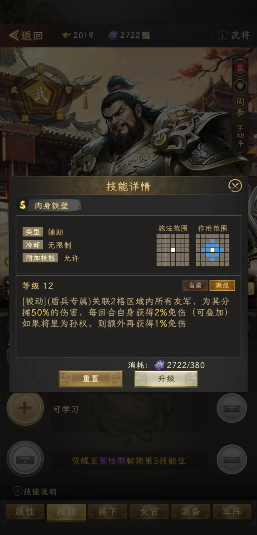 这个特性让他在长回合的战斗中(比如 “生存 - 徐州守卫战”(50 回合防御),甚至 “官渡之战”(99 回合灭敌)等)就是神一样的存在。如果再配上其他物理 + 谋略伤害减少的技能(如 “铁血御盾”,但注意:伤害减少≠免伤),周泰在短回合的战斗中也可以当核心武将用(比如七擒孟获中吴国的战斗)。