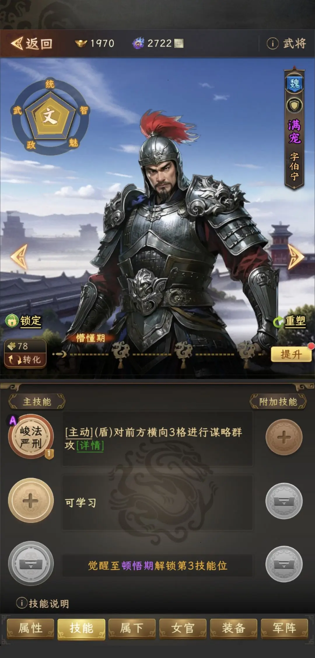 品质:金色(避免跟其他红将争抢红将魂,金将魂可通过铜钱招贤获取);