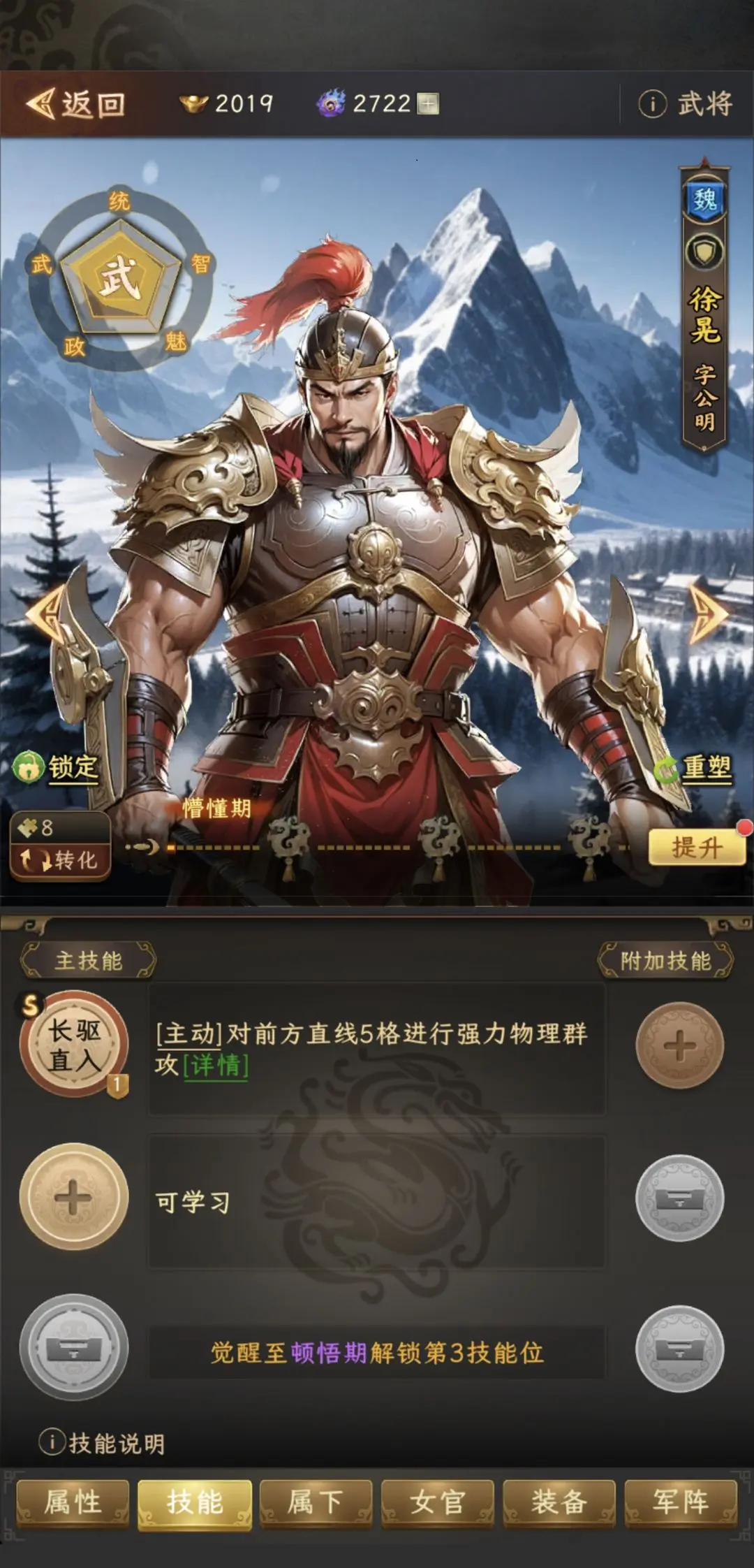 上面特性让徐晃可以快速觉醒到高阶,在魏 / 蜀 / 吴 / 群阵营中都能发挥至关重要的作用,比如废掉敌方的核武器(像 “七星灯”“落凤之殇”“云大怒” 等),同时 “虎卫军” 可保核心武将(如赵云、羊祜、诸葛恪)不死,本身的远攻技能也不会让他变成战斗旁观者。如果舍得投入(但不推荐),徐晃可以用统御令(金)带金色副将,配上装备 - 马(选迅盾魏,可多移动 2 步)可以跑得跟骑兵一样快。徐晃的豪华版是典韦。