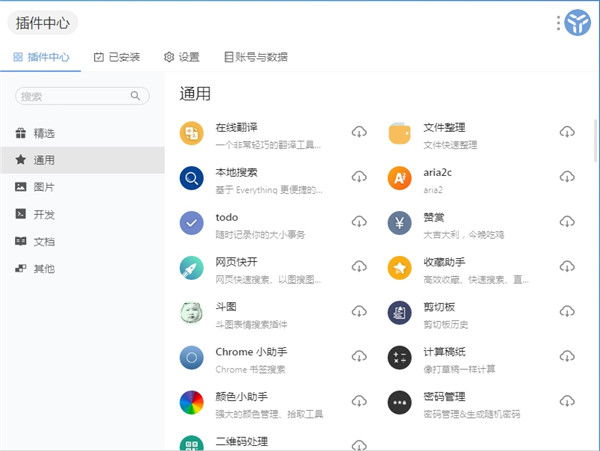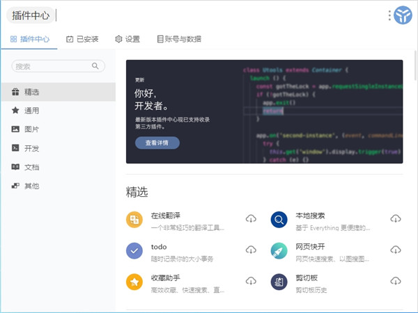 1、快速启动 强大的快速启动,比你想象的更加深入。对中文语义的友好支持,首字母检索等。 2、自动识别 支持多种输入源呼出插件,例如:字符输入、文件拖拽、截图粘贴,亦能够自动识别输入内容进入相应插件,如json、时间戳、base64等。 3、数据同步 各插件产生的数据将保存到本地数据库中。为了便于在不同设备之间共享数据,或是预防重装系统造成数据丢失,我们提供云端数据备份同步服务,登录后可一键开启。 4、高度自由 一切皆插件的设计,可以允许你高度自由的定义自己的开发工具,现在你也可以扩展第三方插件或者开发属于自己的插件。